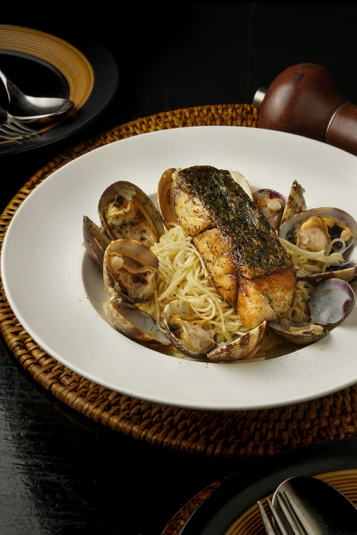 Grilled Boneless Kühlbarra®️ Barramundi w Angel-hair Pasta in Clam Sauce