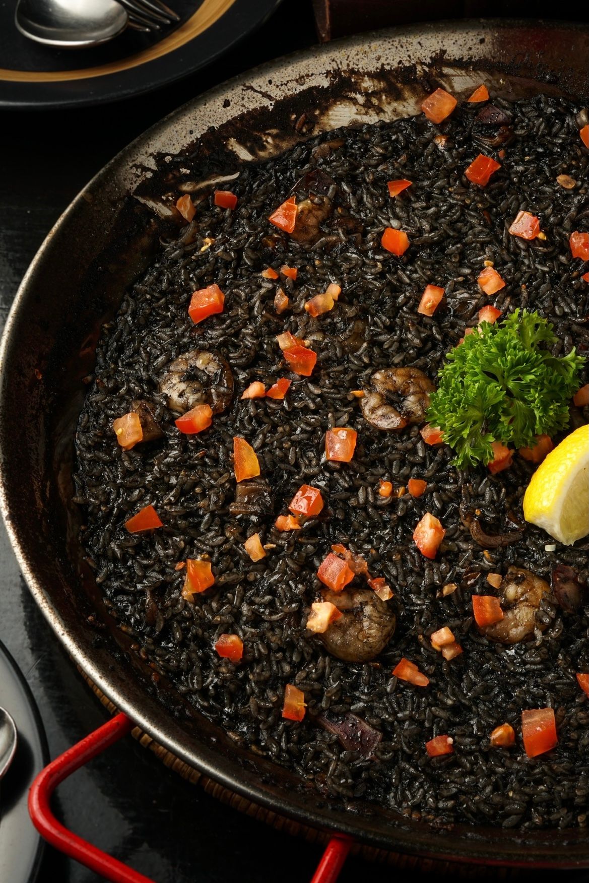 Squid-Ink Shrimp & Calamari Pan Rice Dish [IMPORTANT: our paellas are cooked from scratch and require a min 25 mins when not busy, could be over an hour when busy]