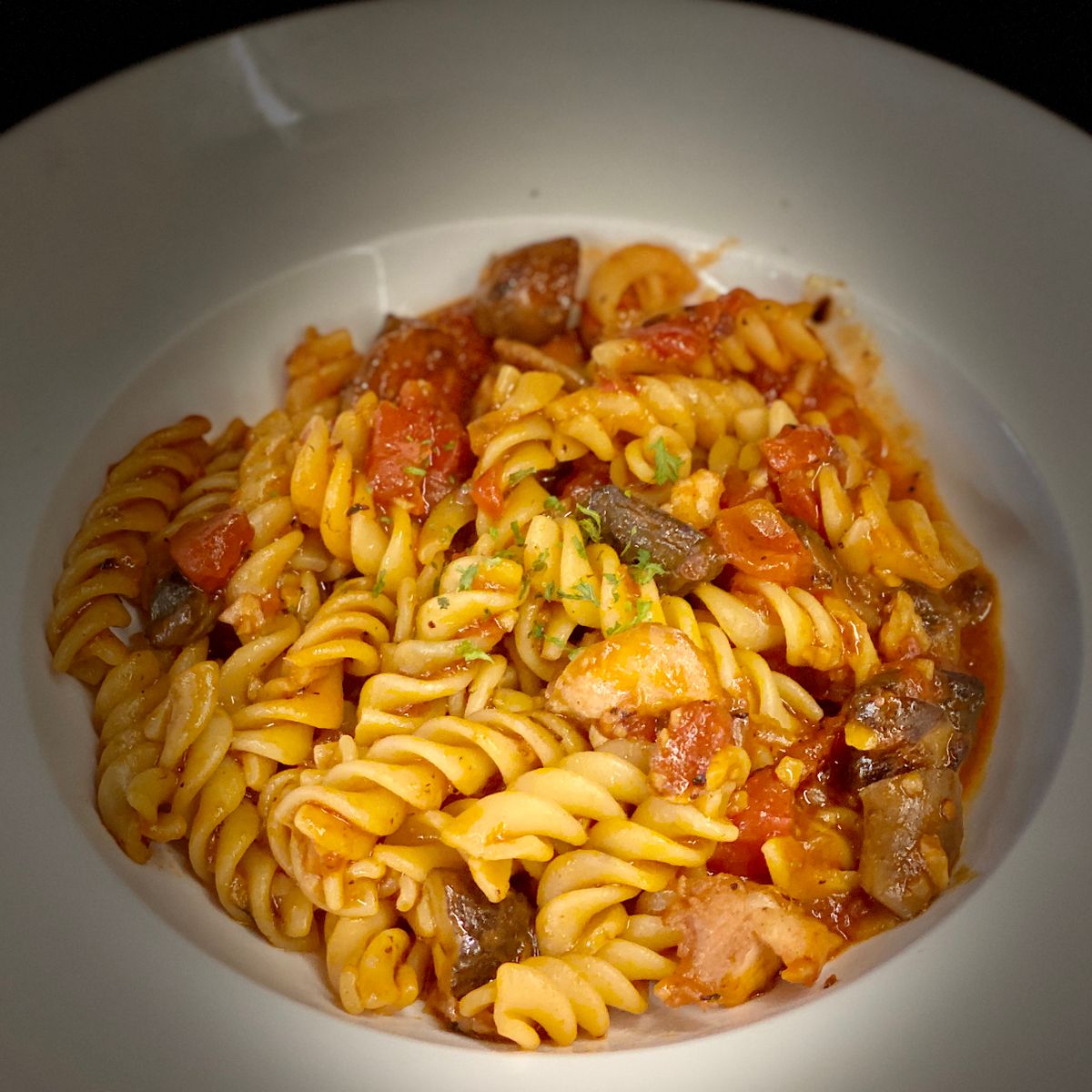 Kids’ Tomato or Cream Sauce Pasta w Chicken Thigh Meat & Mushrooms (pic: tomato-based sauce)