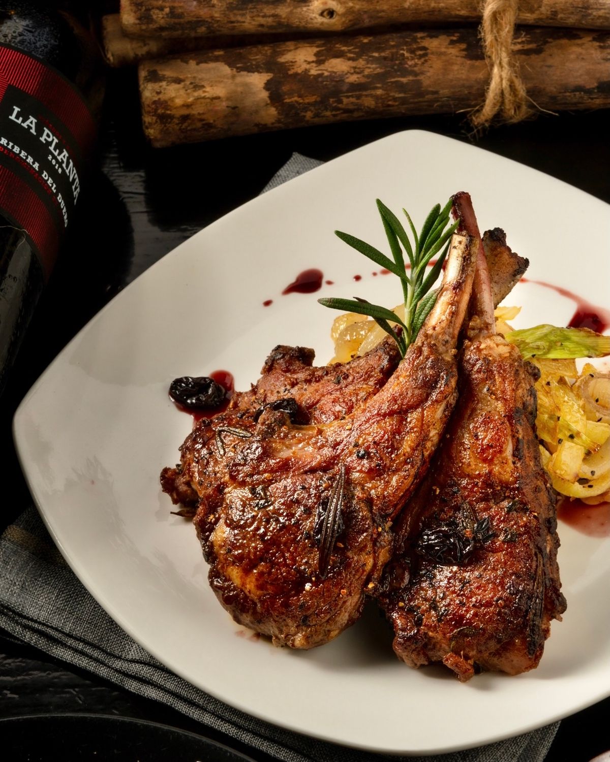 Griddled Lamb Riblets in Red Wine Sauce w Root-vegetables