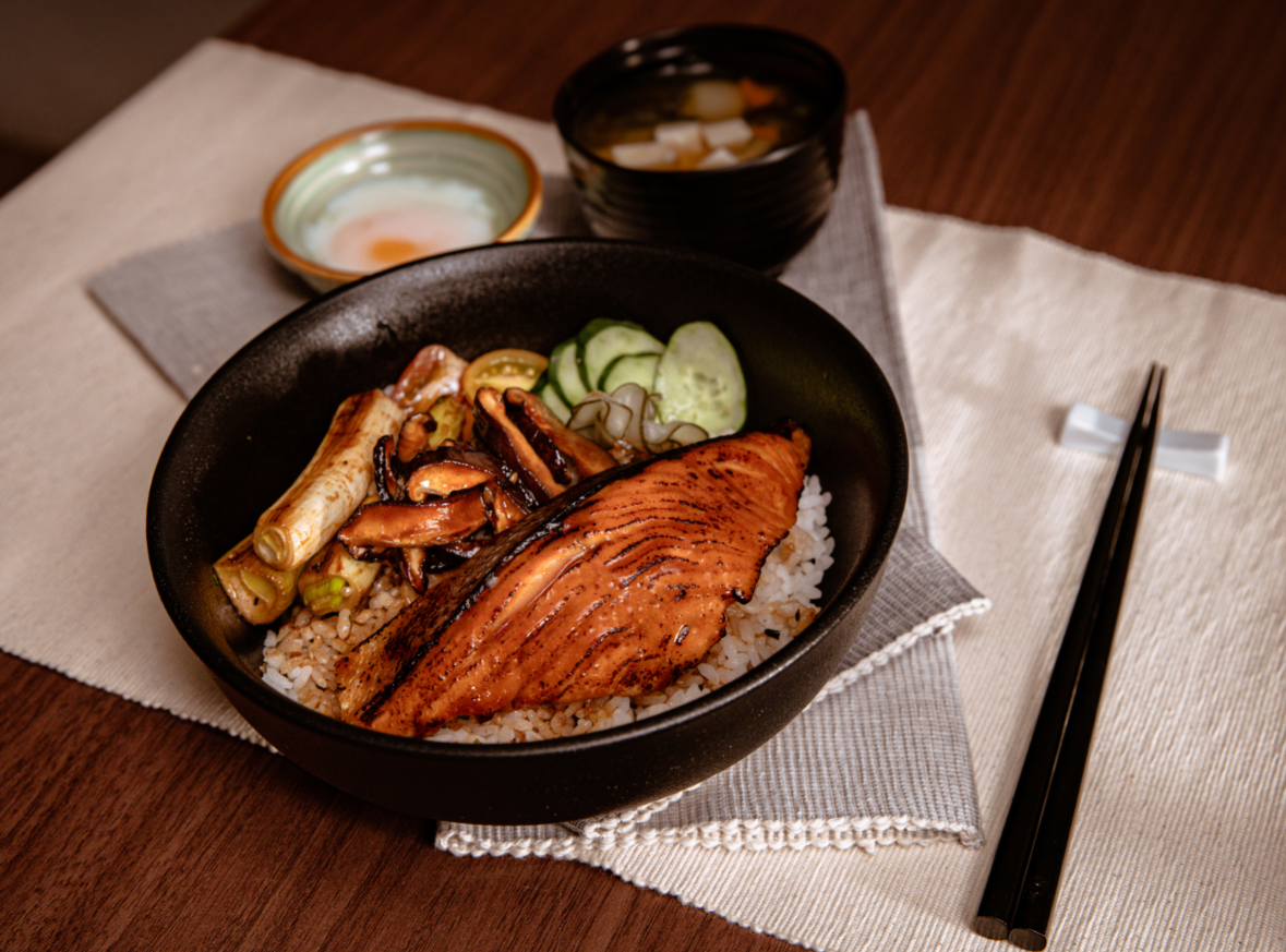 All-time-favourite teriyaki salmon, served with pickles and vegetables.