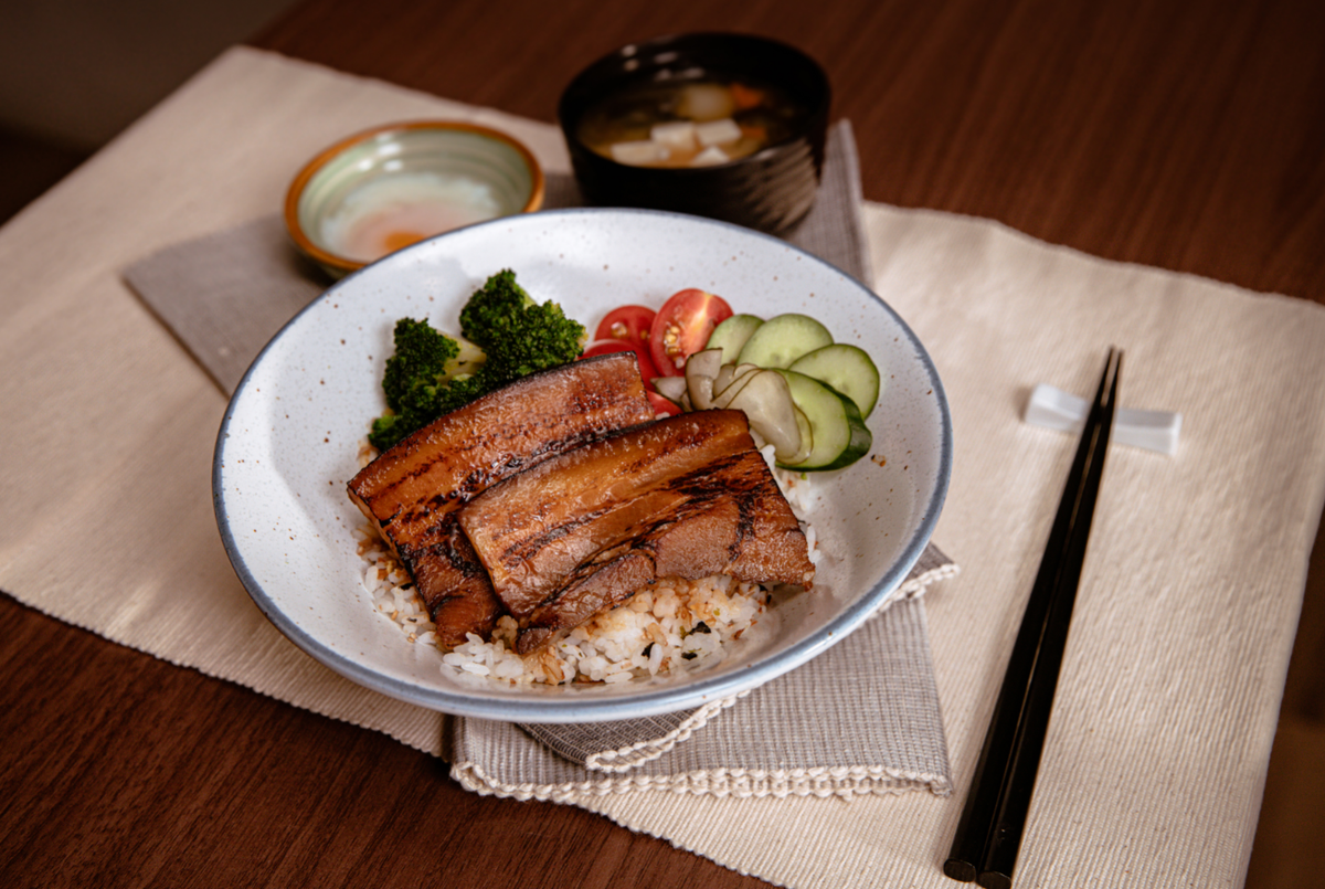 Pork belly grilled perfectly served with pickles and vegetables in soy sauce, topped with Furekake.