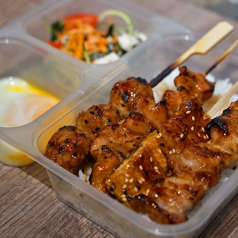 Skewers: 1 Chicken, 1 Pork, 1 Handmade Meatballs, 1 Unagi. Comes with Japanese rice, Salad with Goma dressing and Onsen Egg