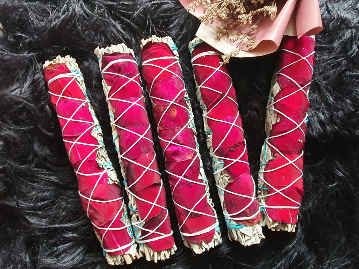 I personally tie these Rose White Sage wands, you will see when I attached the fresh petals to the lovely dried petals. Rose: Known to bring love and happiness >> Sage: Energy Cleansing - Removes Negative Energy - Harmonizes the Mind. Imagine joining the 2 powerful items together, Rose Wands is all about LOVE. This creation uses whole rose petals to bring in love, light, clarity, growth, purpose and a balance to your mind, body and spirit. Together with Sage, it clears away negative thoughts and feelings and harmonize the body by releasing the stress of your spirit. Each Stick is approximately 22 to 23 cm long. Please keep in mind, these are handmade so measurements may vary. Some broken petals may fall off.