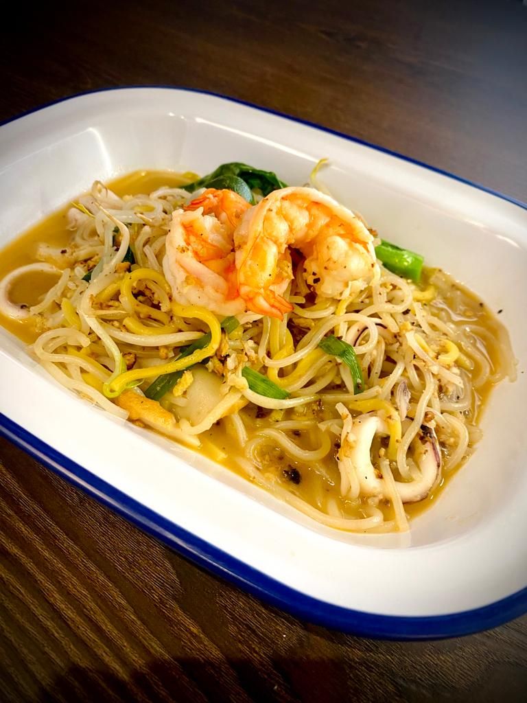 aka Hokkien Mee. With Fresh Prawns, Sotong, Fishcake, Bean sprouts, Baby Chye Sim and Chives.