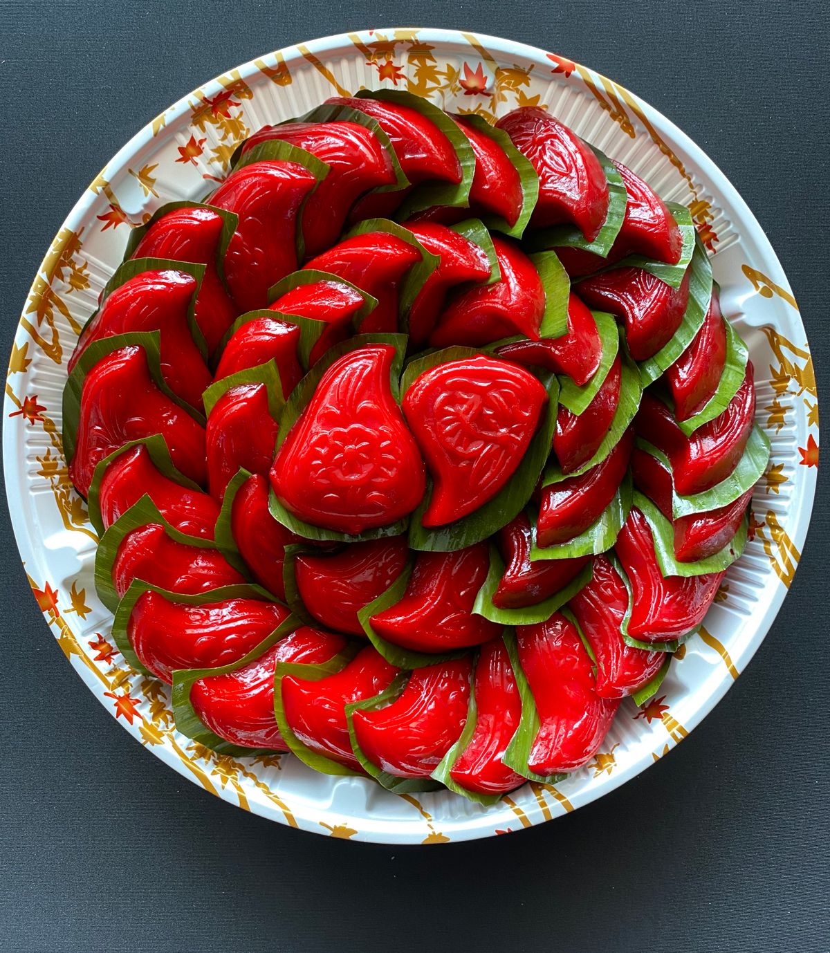 Dainty Sized, vegetarian. Our Teochew Tiam Tor Kueh skin is infused with fresh pandan water giving its wonderful fragrance, with choice of Brown-sugared Dousha or House-blended Peanut Filling with Candied Tangerine. Similar to the Hokkien's version commonly known as Ang Gu Kueh.