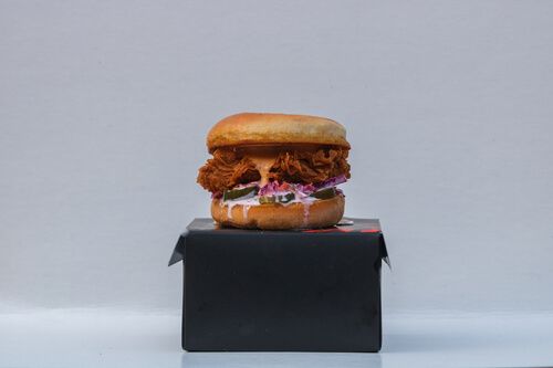 Crispy chicken, creamy red cabbage slaw, 7sauce, dill pickles, toasted tomato bun