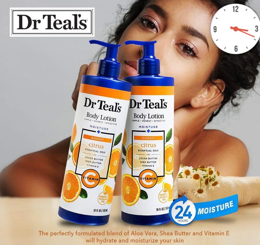 Revitalisez et hydratez votre peau avec le Lait Corps Dr Teal's Ă la Vitamine C et aux Huiles Essentielles d'Agrumes.