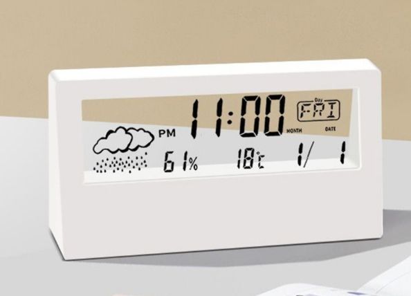 Transparent table clock decor, with alarm, timer, weather temperature, and more.