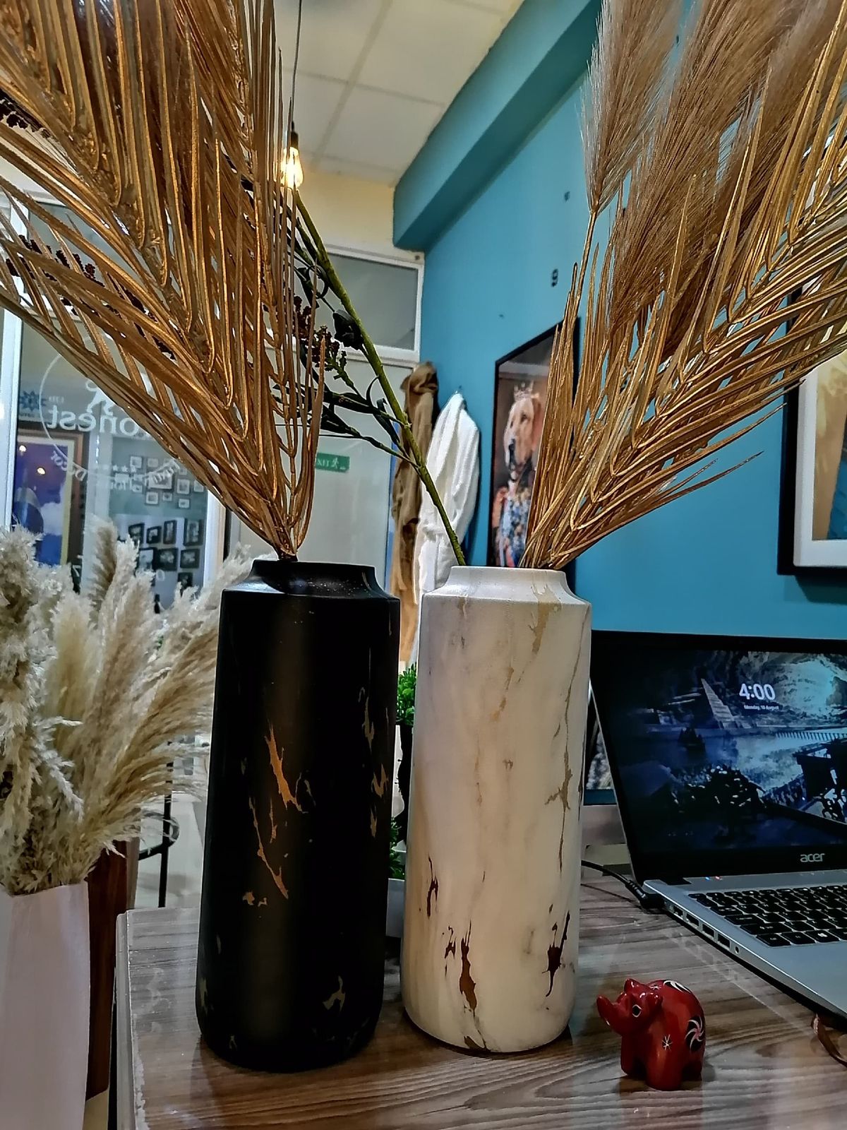 Set of 2 marble ceramic vases with gold artificial leaves.