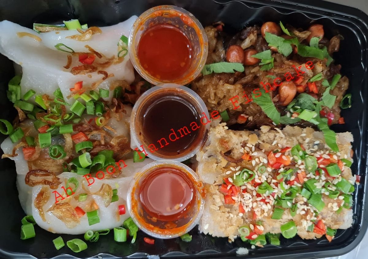 (Steamed Glutinous Rice, Soon Kueh, Yam Cake (Fixed, no choosing of items) Glutinuous rice with peanut, mushroom and dried shrimp, Soon Kueh filled with turnip and dried shrimp, Yam cake with mushroom and dried shrimp.