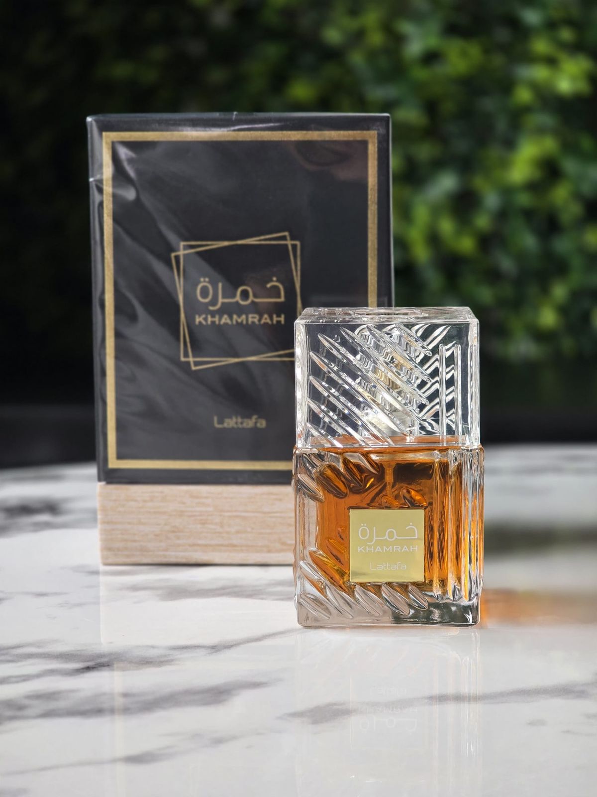 O aroma do Lattafa Khamrah é um perfume que foi lançado em 2022. Oferece inicialmente um aroma fresco de bergamota, temperado com uma pitada de canela quente e doce e noz-moscada intensa.