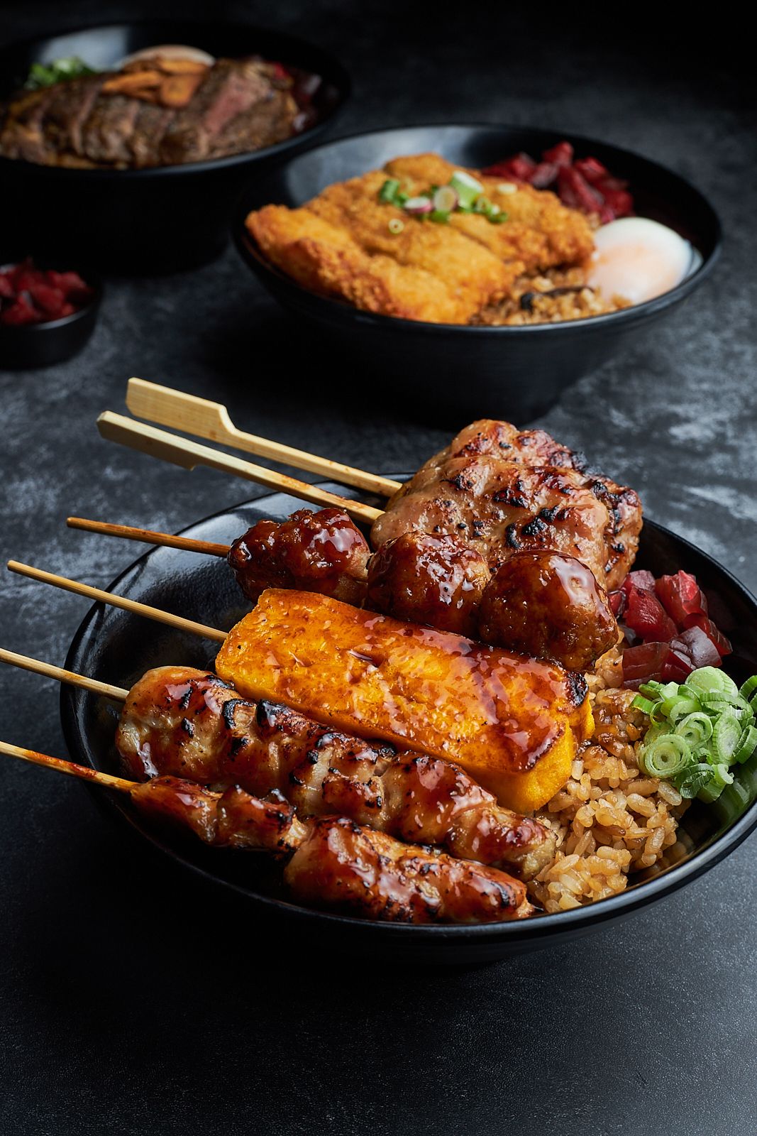 2 chicken thigh, 2 thai-style marinated pork, 1 pork meatball, 1 tamago, Japanese mushroom truffle rice, japanese pickles