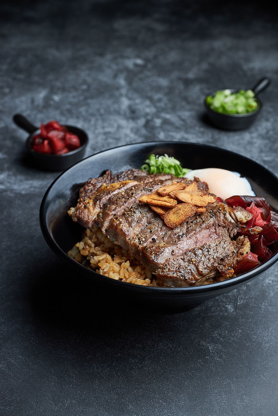Angus ribeye (150g), japanese mushroom truffle rice, onsen egg, japanese pickles, homemade apple teriyaki sauce