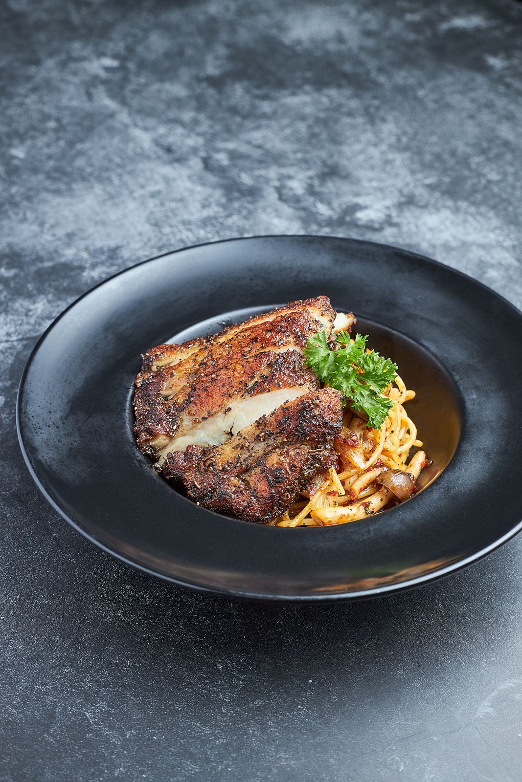 Pan seared garlic herb Chicken, spaghetti, shimeji mushrooms, thai basil