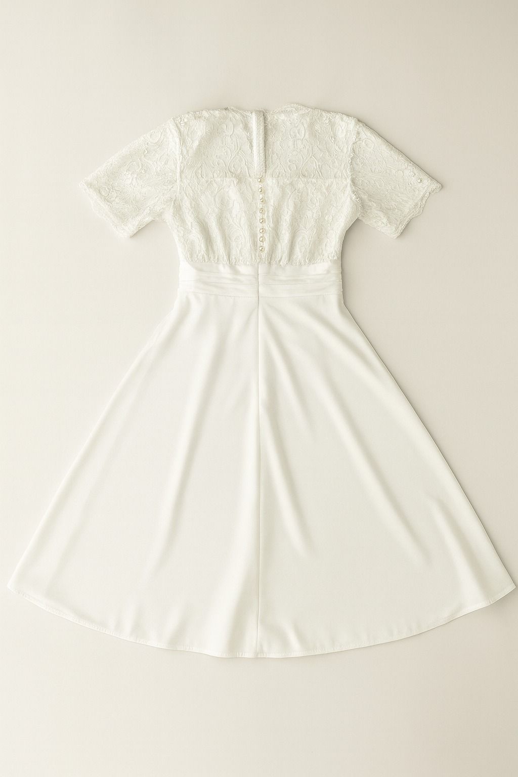 Vestido de largo midi en color blanco, con parte superior confeccionada en delicado encaje floral y mangas cortas. Presenta botones decorativos en la parte trasera y una falda amplia de caída elegante que realza la silueta con sutileza. Su diseño combina romanticismo y sofisticación, ideal para ocasiones formales, eventos especiales o celebraciones de día.
