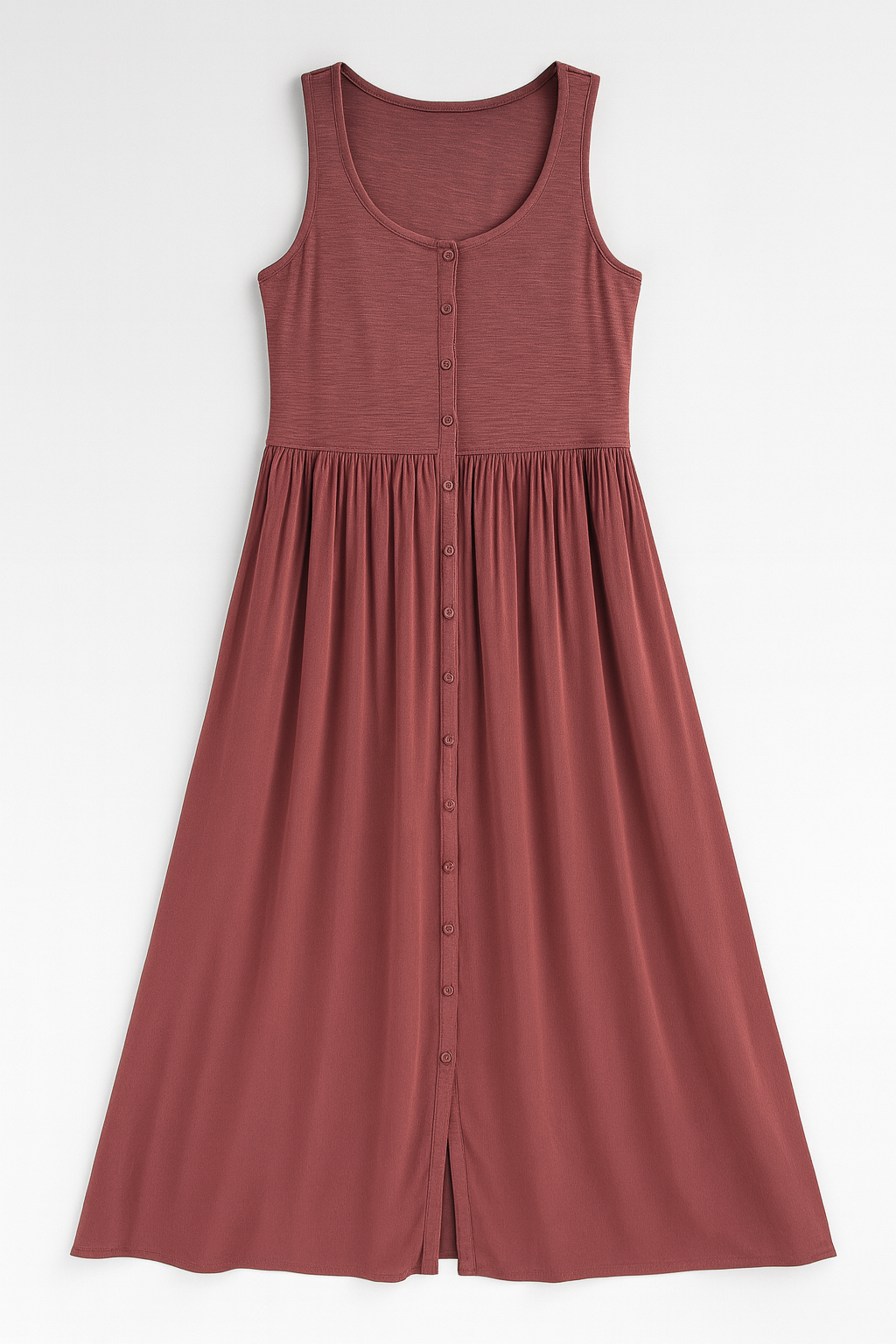 Vestido sin mangas en tono rosado taupe, con escote redondo y botones funcionales al frente. Su corte fluido y cintura ligeramente fruncida brindan comodidad y movimiento, ideal para un look fresco y casual. Perfecto para combinar con sandalias o zapatillas en días soleados.