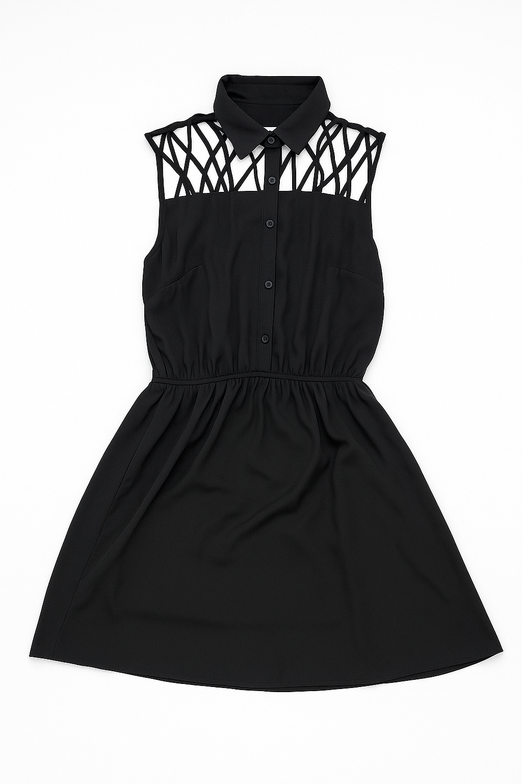 Vestido corto sin mangas en tono negro, con un diseño moderno y elegante. Presenta cuello camisero y botones frontales, combinado con un detalle entrelazado en la parte superior que crea un efecto geométrico único y sofisticado. La cintura ligeramente ajustada realza la silueta y la falda con caída suave aporta movimiento y frescura.