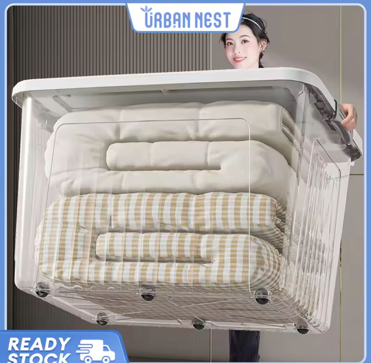 Plastic transparent storage box, dust proof mega box with wheels storage organizer,