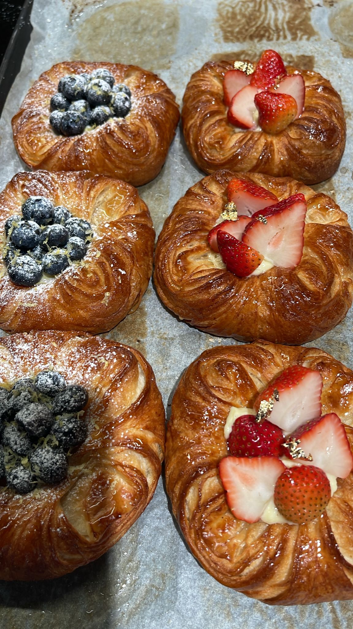 Must Try! Fresh strawberry / blueberry fruits with vanilla creme patissiere on flaky danish.