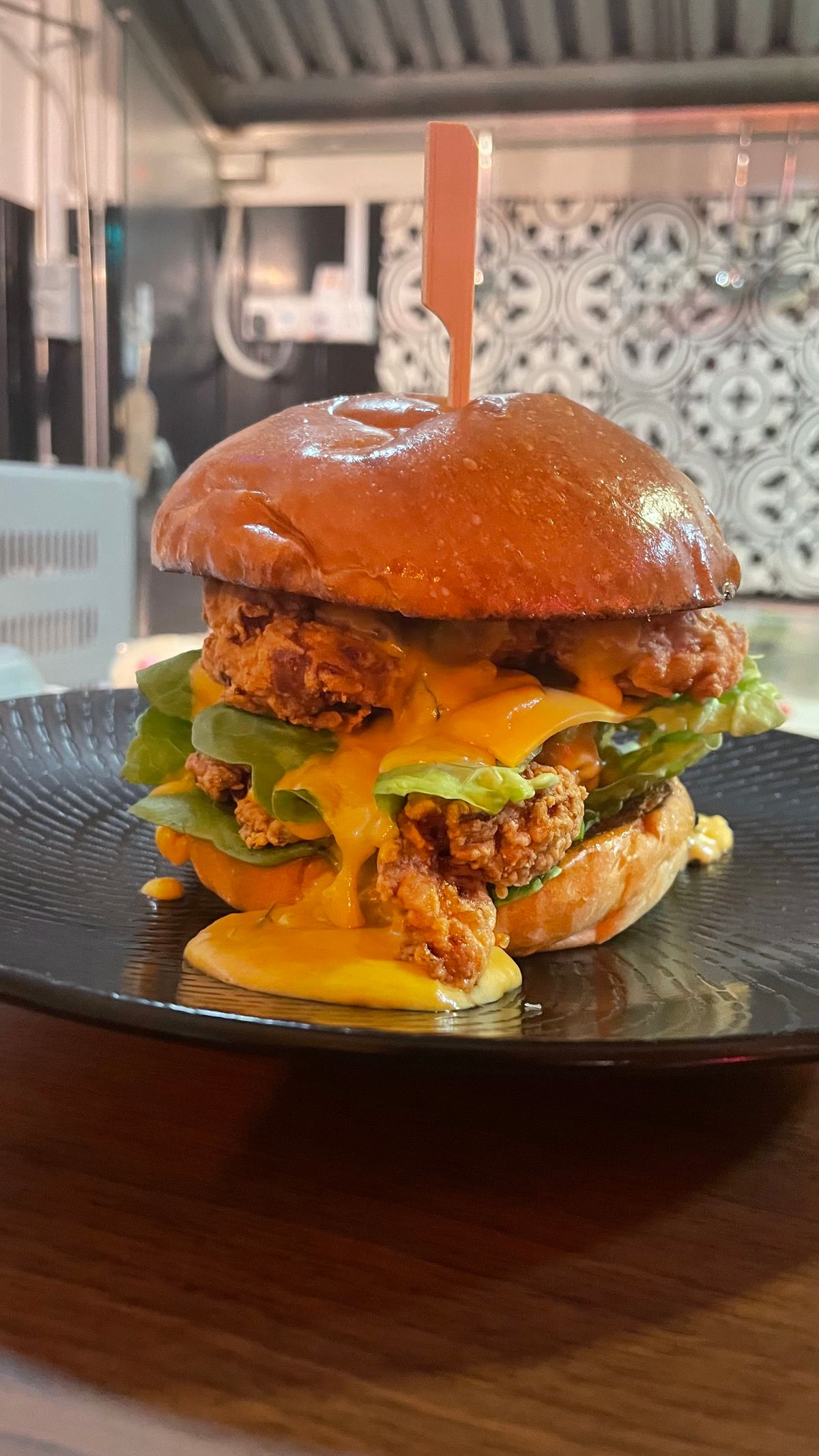 Miso marinated chicken thigh, salted egg sauce, lettuce, tomato, pickled cucumbers