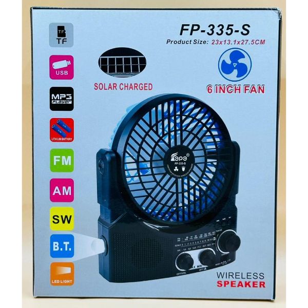 Haut parleur sans fil FEPE FP-225-S + ventilo radio Bluetooth avec lecteur de musique USB/TF/BT, 6 pouces, panneau solaire 5 V
