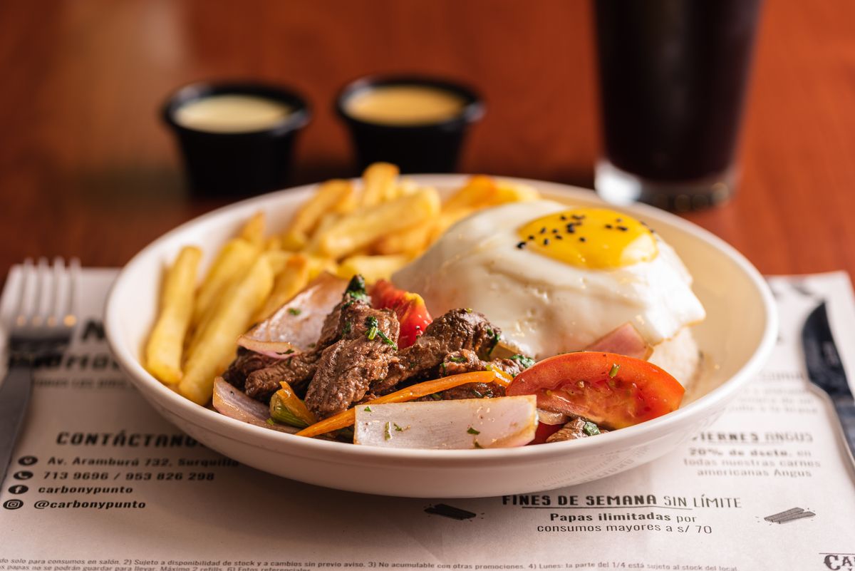 Lomo saltado de lomo fino (200 gr) con cebolla y tomate. Viene con huevo frito, papas fritas, arroz blanco y salsas (1 ají pollero, 1 mayonesa).