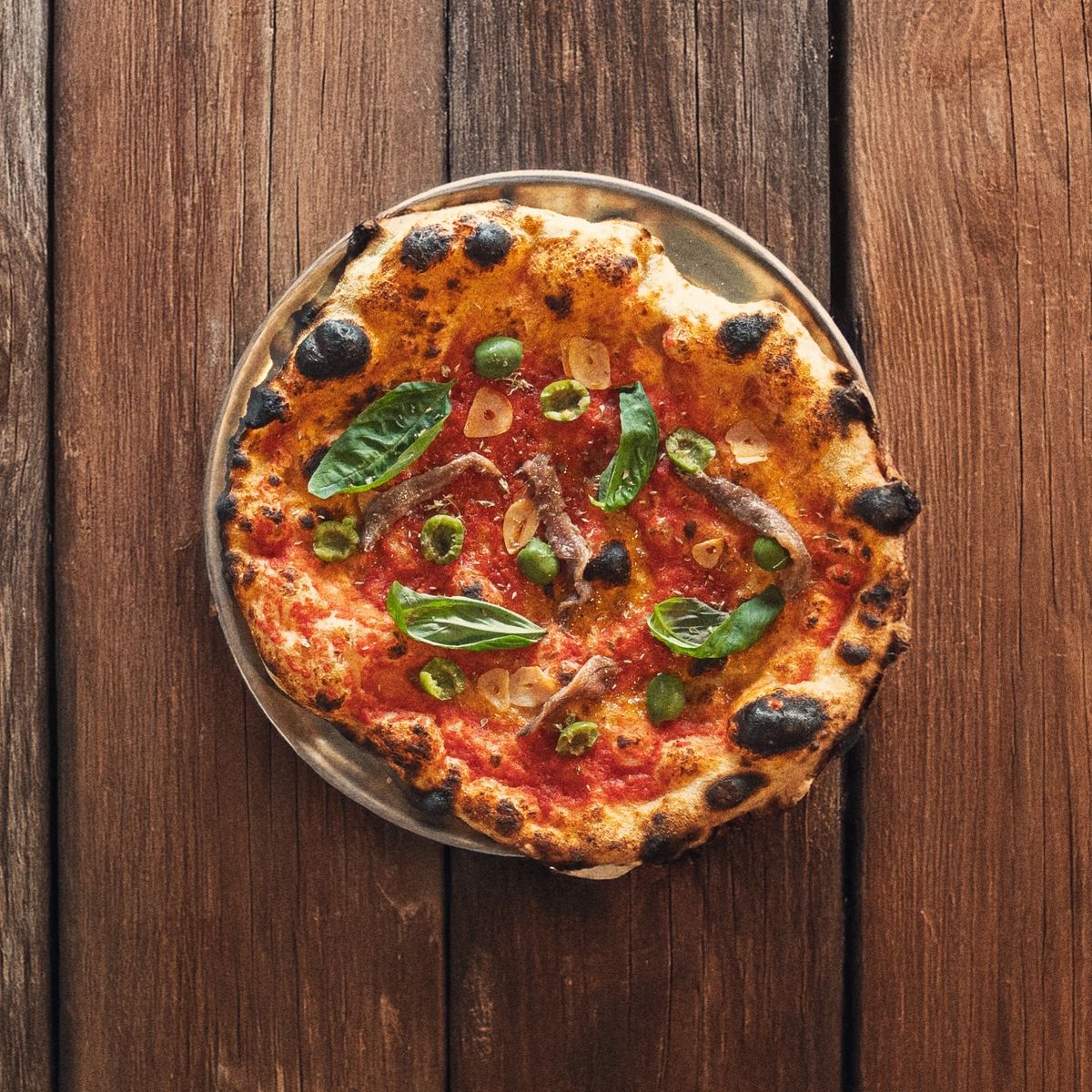 crushed tomato sauce, anchovies, castelvetrano olives, oregano, sliced garlic, fresh basil