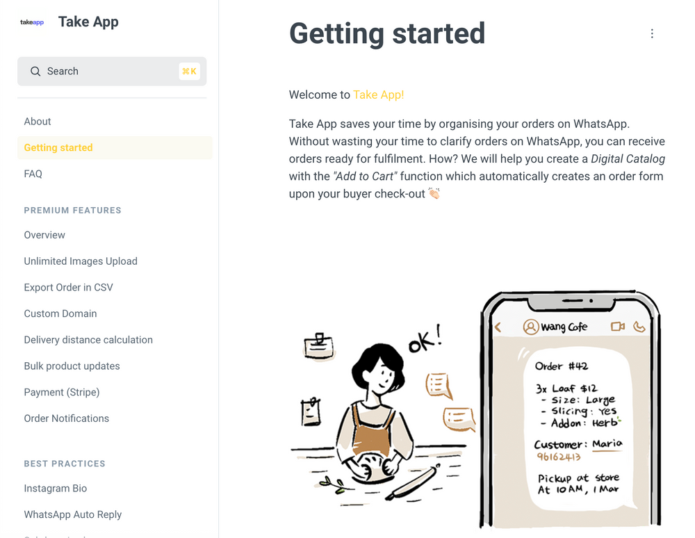 AnalyticsWe added Analytics page. You can get insight into your visitors, analyze the trend of orders and sales. Find menu "Analytics"Seamless Stripe CheckoutWe will let customers choose payment methods before sending message if you set payment methods. If they choose Stripe payment, they will be redirected to Stripe's payment page and comeback once the payment is completed. This is seamless and you can save time to guide customers manually in WhatsApp.Learn more about Stripe paymenthttps://docs.take.app/premium-features/payment-stripe