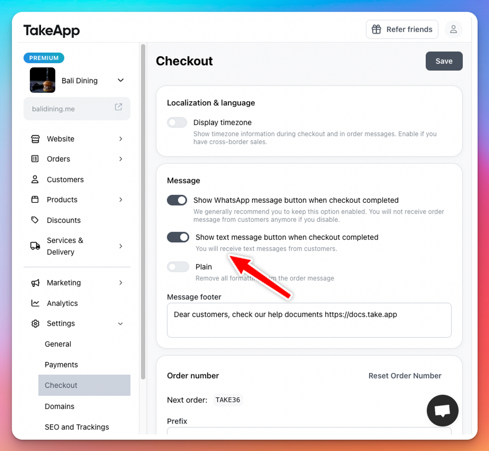 Customers can send you order messages via text (SMS). Once the option enabled, customers can choose WhatsApp or Text button to send you order message. https://help.take.app/en/article/order-message-buttons-1mx8dat