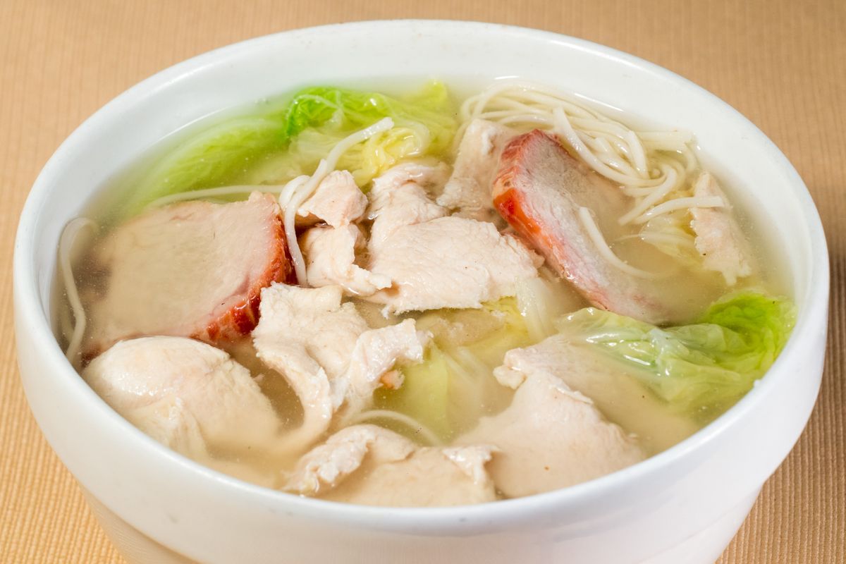 Sopa con tallarín, pechuga de pollo, chancho asado y col china.