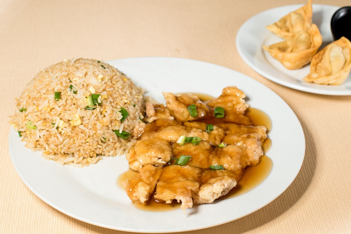 Entrada a elección, arroz chaufa, pollo chijaukay (salado).