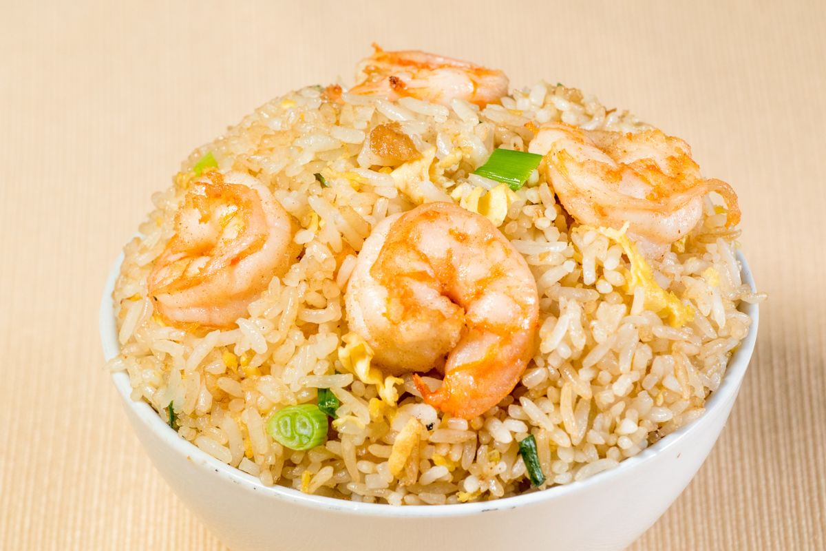 Arroz salteado con langostinos, huevo y cebolla china.