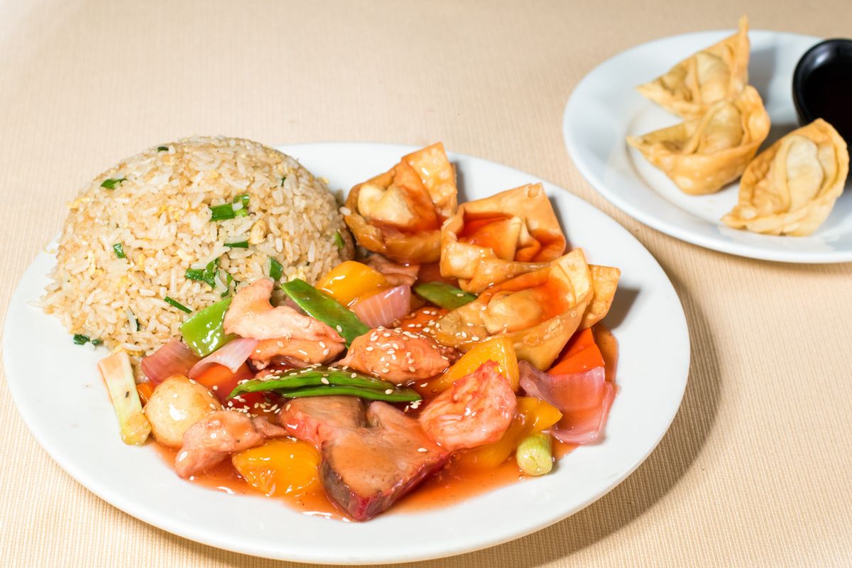 Entrada a elección, arroz chaufa, kamlú wantan (pollo, chancho, langostino, huevo codorniz, piña, nabo encurtido. wantan frito).