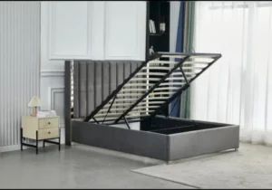 Lit coffre design en coloris gris, décliné en plusieurs variations. Disponible en version Prince.