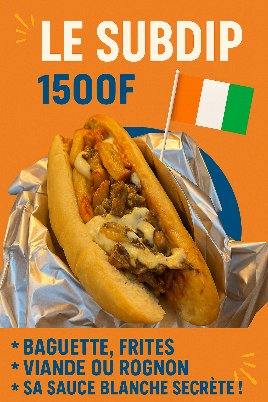Le SUBDIP : une baguette bien dorée, garnie de viande ou rognon savoureux, accompagnée de frites croustillantes et relevée par notre sauce blanche secrète… Un vrai concentré de plaisir à seulement 1500F !