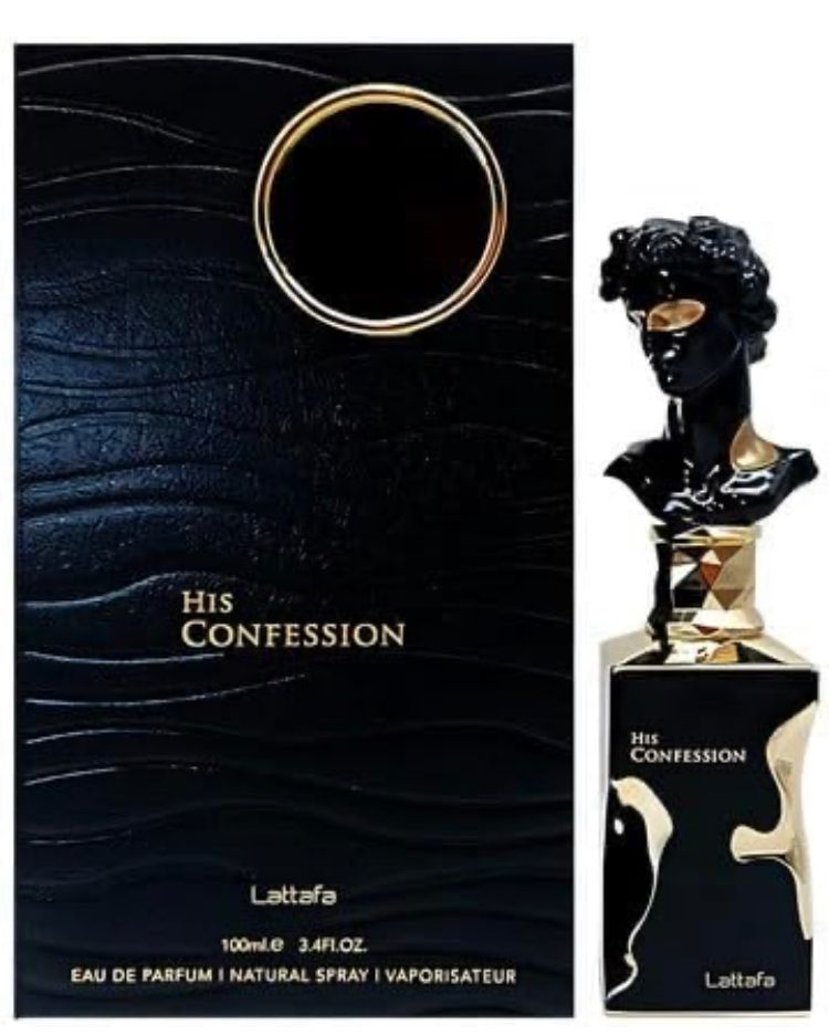 His Confession by Lattafa Perfumes is a Oriental Woody fragrance for men. This is a new fragrance. His Confession was launched in 2024. Top notes are Cinnamon, Lavender and Mandarin; middle notes are Benzoin, Iris, Mahonial and Cypress; base notes are Vanilla, Incense, Tonka, Patchouli, Cedarwood and Amber.