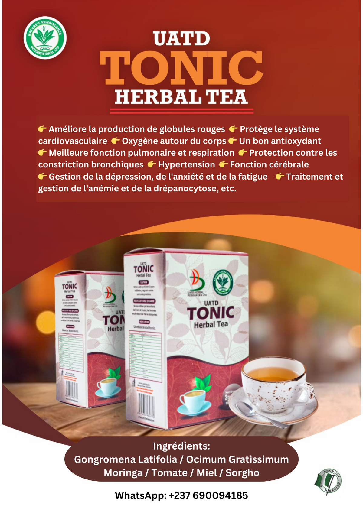 Ce thé est un mélange de Gongromena Latifolia, Ocimum Gratissimum, Moringa, Tomate, Miel et Sorgho. Le thé NRI Tonic améliore la production de globules rouges, protège le système cardiovasculaire et favorise la circulation de l'oxygène. Ce thé aide au traitement et à la gestion de l'anémie falciforme, améliore la fonction pulmonaire et la respiration. Il protège contre les constrictions bronchiques et aide à gérer la dépression, l'anxiété et la fatigue.
