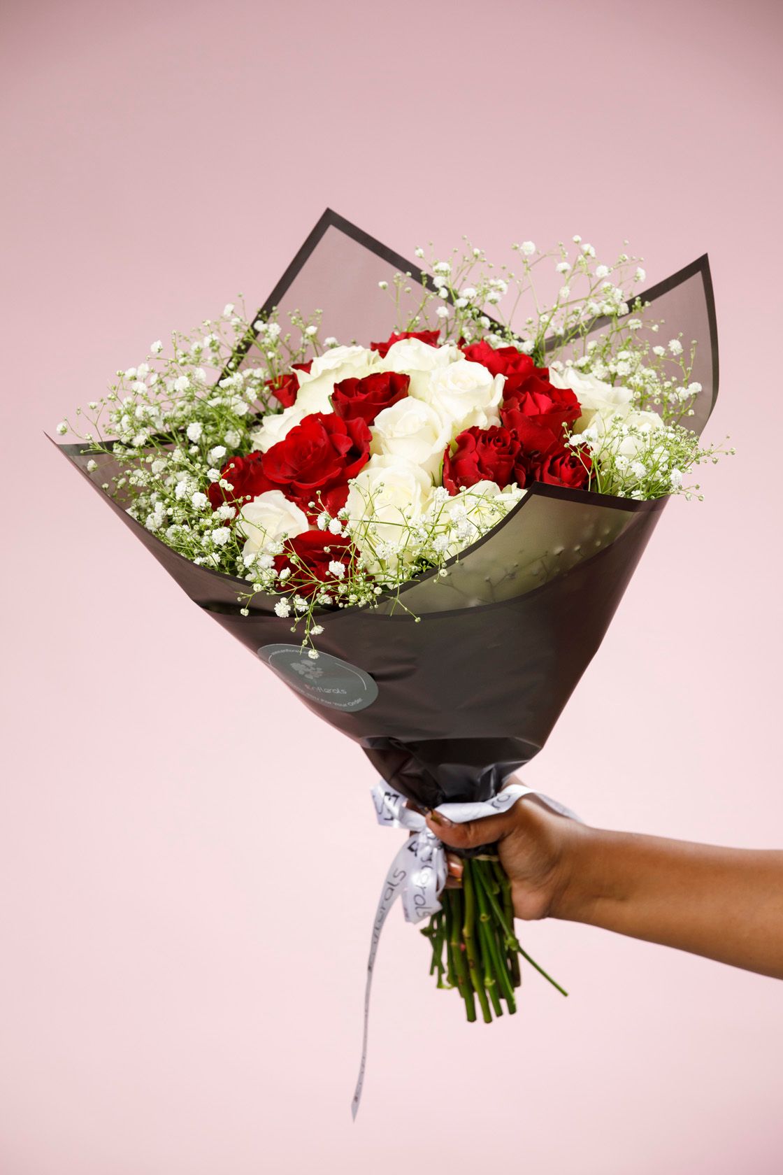 Mixed of romantic red and white roses with a touch of Gypsophila.