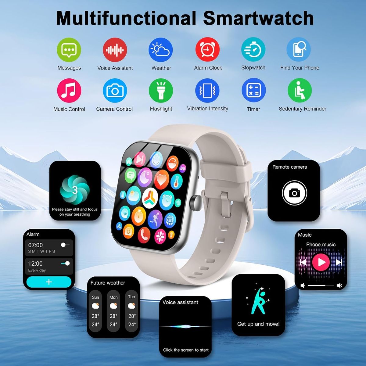Bluetooth 5.3 with Make/Answer Call: The womens fitness tracker adopt bluetooth 5.3 version for a faster and more stable connection between your fitness watch women and smartphone. With the built-in microphone and Hi-Fi speaker that minimize background noise, you can receive and make clear calls directly from your smart watches. Receive texts and app notifications, including facebook, whatsApp, instagram, X, etc. through vibrating alerts. So that you will never miss any important information.