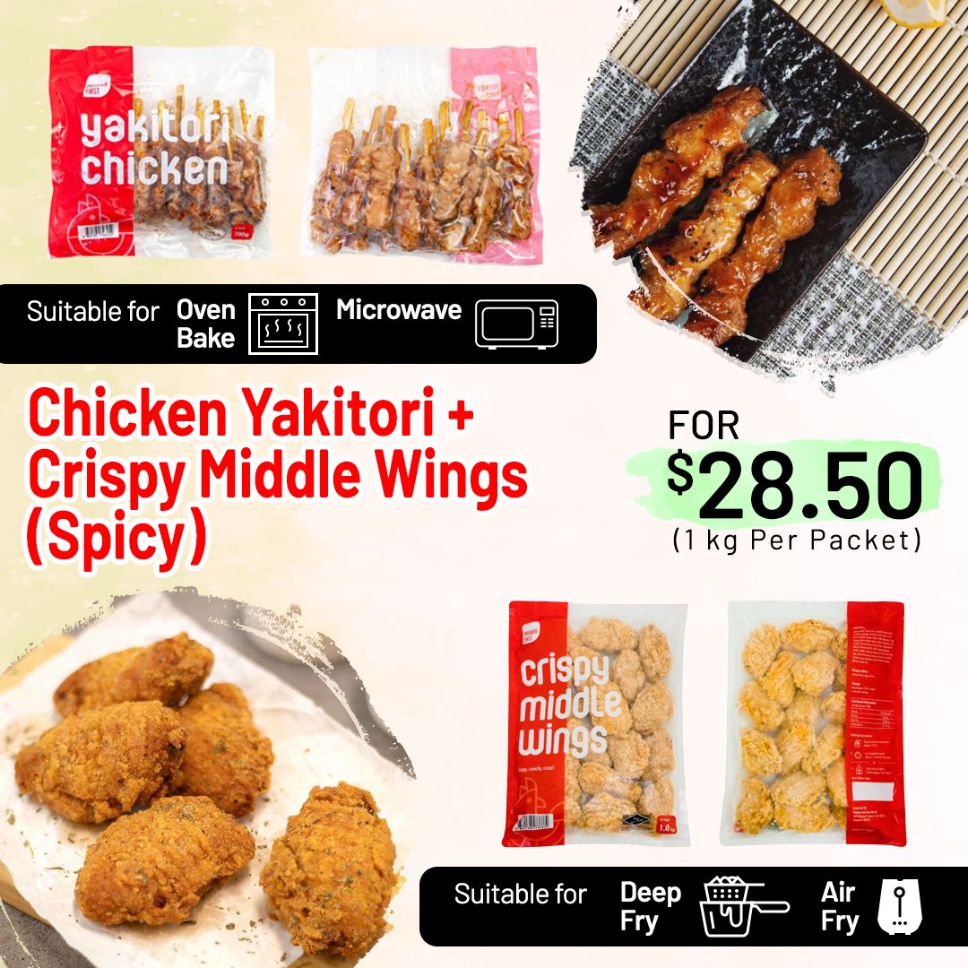 Halal Certified | Combo 2 comes with 1 packet of 20 Yakitori Chicken Skewers and 1 kg of Crispy Middle Wing (Spicy) from Premier First