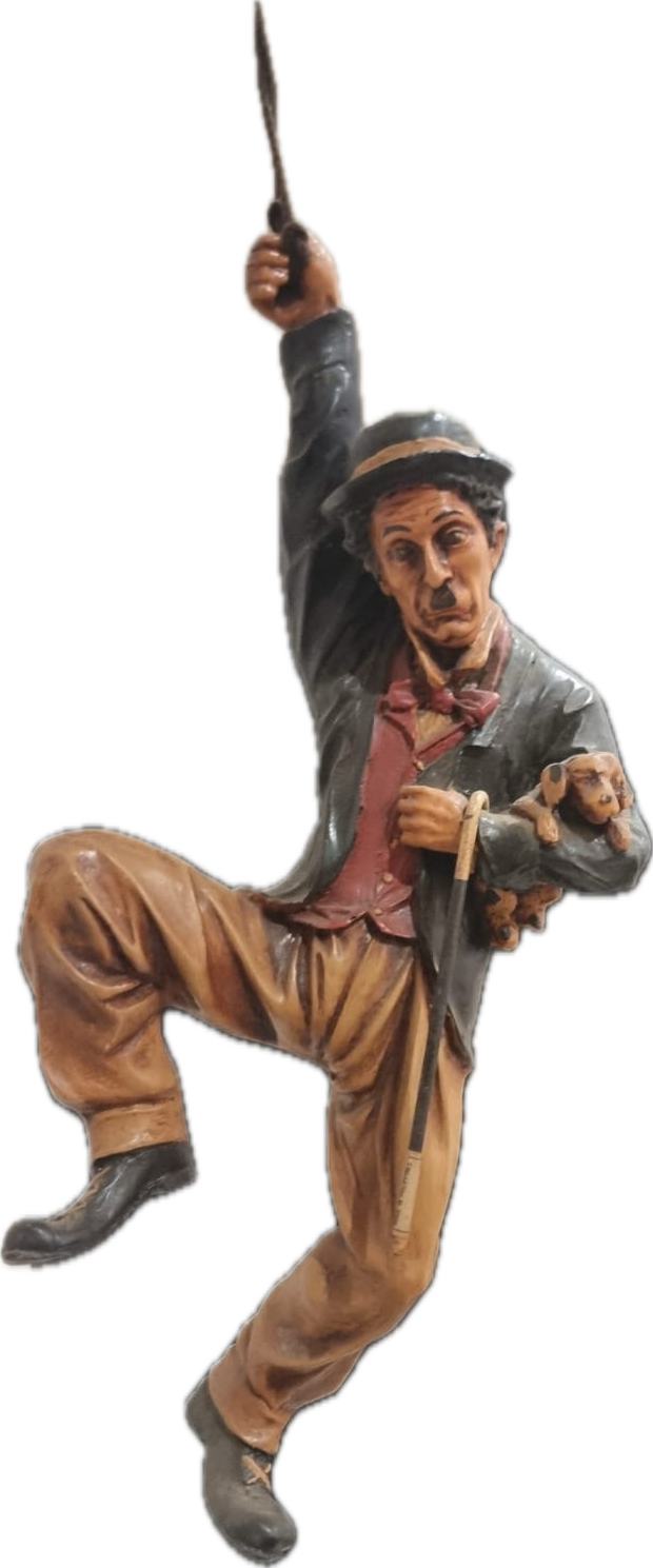 This sculpture depicts a comic male figure in bowler hat and vintage attire, suspended from a rope... styled in the likeness of a Charlie Chaplin–inspired character, complete with cane, bow tie, and puppy tucked under one arm. Measuring approximately 60 cm high, it’s a humorous hanging figurine designed as a conversation piece or statement wall accent.