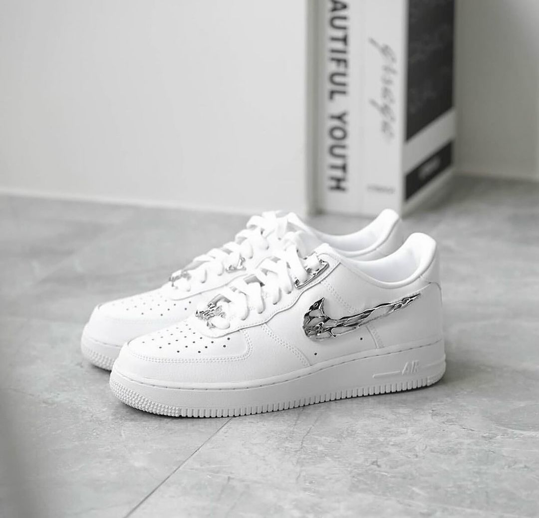 Crafted with premium materials, the Air Force 1 Low "Molten Metal" features a combination of smooth leather and reflective overlays that catch the light from every angle. The sleek silhouette is elevated with metallic gold or silver finishes, adding a touch of opulence to the classic design.
