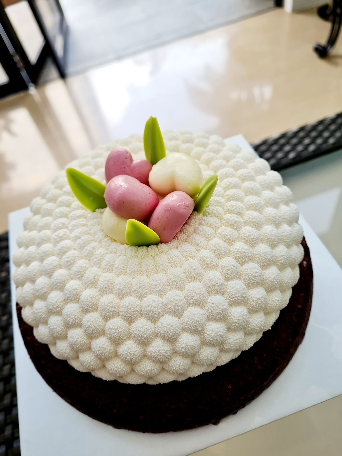 A beautifully design white dome light premium cream cheese cake with French champagne,
