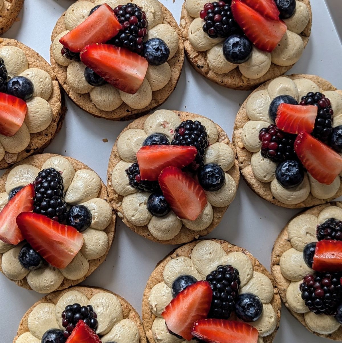 The airy coffee and walnut dacquoise offers a light and nutty richness, complemented with a luxurious coffee mousseline cream infused with deep aromatic espresso notes. This is crowned with a vibrant medley of fresh berries* for a sublime blend of textures and flavours.