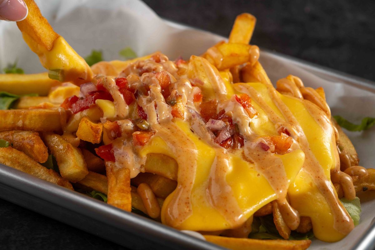 Regular Fries with Lettuce, Cheesesaus, Tomato Salsa, with your choice of toppings.