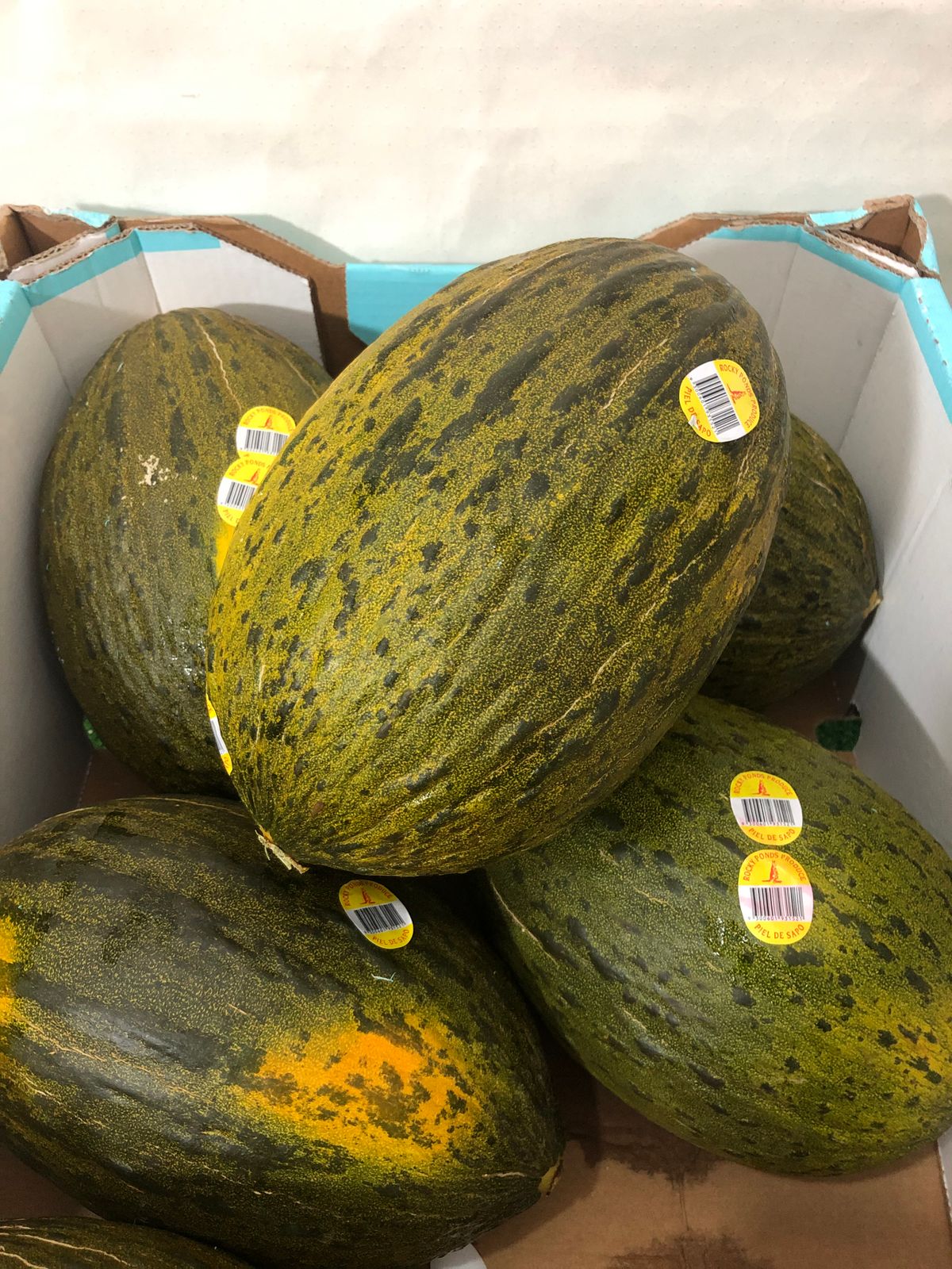 Large size. Also know as the Santa Claus melon, sometimes known as Christmas melon or Piel de Sapo, is a variety of melon originating in Spain that grows to about a foot in length and in shape of rugby ball.