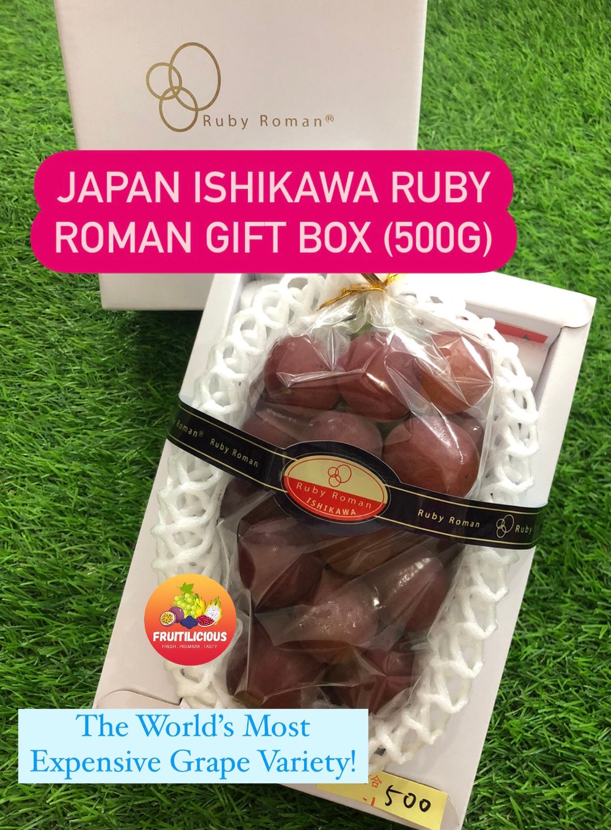 Ruby Roman Grapes are a variety of table grape grown in Ishikawa Prefecture, Japan. They are among the most expensive in the world, prized for their sweetness and low acidity. Each grape is the size of a ping-pong ball and gives off an alluring wine fragrance with intense sweetess. This makes it once of the more precious and coveted fruits due to its unqiue characteristic and limited supply.
