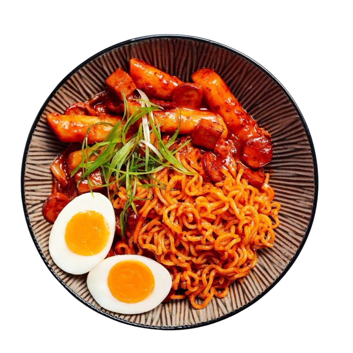 Dry Korean noodle with tteokboki and sausage มาม่าแห้งต๊อกไส้กรอก