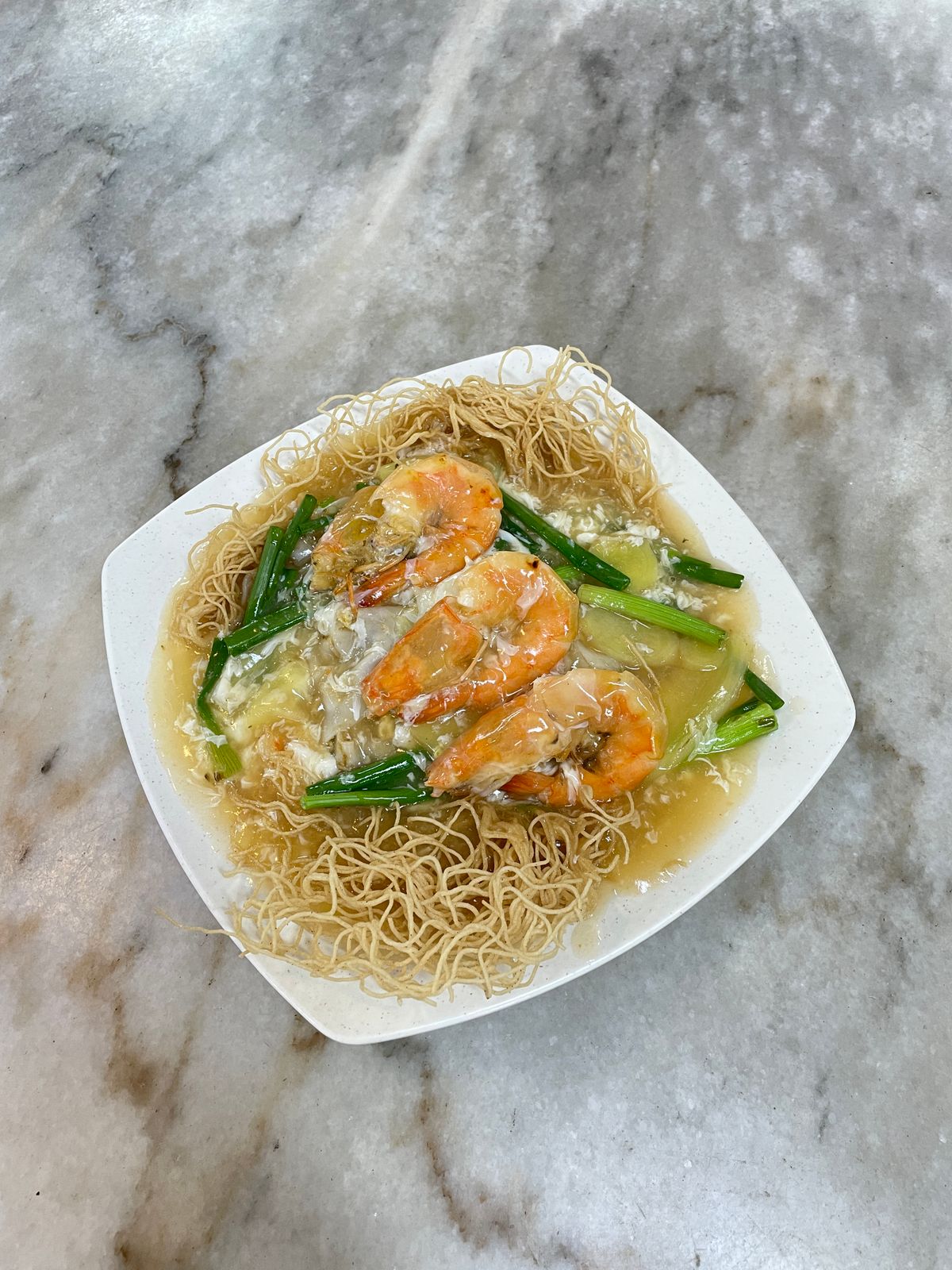 Hor Fun and Bee Hoon with Big prawns in a special eggy gravy.